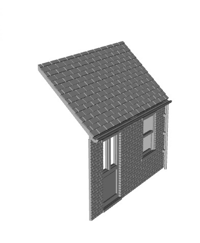 GWR style goods shed in brick standard GWR coaling stage. This captures the overall look, as individual sheds would have design differences. Brickwork is standard English bond as used by the GWR in all its brick buildings. Interior walls are also brick covered, but internal raised platform not